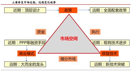 政策層面。長期尺度下,政策層面最值得期待的驅動因素是在土壤修復所有領域、全國大部分區(qū)域的配套性政策全面出臺。與短期尺度相比,長期尺度下政府必須向治理難度更大、經濟效益更弱的修復任務“開刀”。