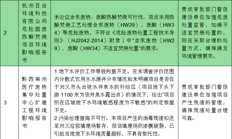 根據(jù)通報文件可知,21個項目中6個為危廢、固廢處理相關(guān)項目,占比28.57%。危廢、固廢相關(guān)環(huán)評項目本身就較為敏感,容易受到審批部門關(guān)注,因此將文件中危廢、固廢相關(guān)環(huán)評受到通報的問題復(fù)制粘貼如下所示: