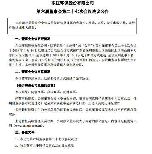 東江環(huán)保公告,經(jīng)董事長提名、公司董事會提名委員會審查,董事會同意聘任姚曙為公司總裁,任期自董事會審議通過之日起至第六屆董事會屆滿之日止。關(guān)于聘任姚曙為公司總裁的議案審議通過后,公司董事長譚侃將不再代理總裁職務(wù)。