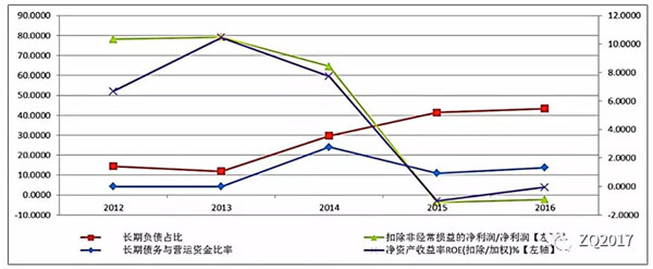 觀察營運(yùn)資本情況,公司近幾年的長期債務(wù)/營運(yùn)資本接近或高于1。2015年?duì)I運(yùn)資本周轉(zhuǎn)率同比降低85%,波動明顯。企業(yè)自由現(xiàn)金流進(jìn)一步說明了公司償債水平:自2012年已處于流出狀態(tài),2015年流出凈額達(dá)到數(shù)十億級,同比增長高達(dá)388%。