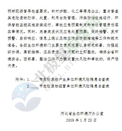 近日,河北省生態(tài)環(huán)境廳發(fā)布了關(guān)于春節(jié)期間加強(qiáng)危險(xiǎn)廢物領(lǐng)域環(huán)境風(fēng)險(xiǎn)防控工作的緊急通知,要求加大涉危險(xiǎn)廢物領(lǐng)域重點(diǎn)行業(yè)企業(yè)的環(huán)境監(jiān)管力度,2月份,全省暫停實(shí)施跨界危險(xiǎn)廢物轉(zhuǎn)運(yùn),特殊情況必須轉(zhuǎn)移的,一事一報(bào)。詳情如下: