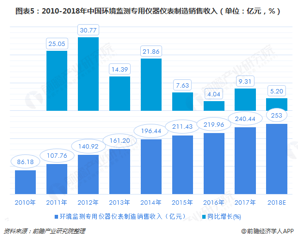 國家統(tǒng)計局的統(tǒng)計數(shù)據(jù)顯示,2017年我國環(huán)境保護專用設備制造業(yè)的銷售收入達到2780億元左右,其中環(huán)境監(jiān)測專用儀器儀表制造銷售收入在240億元左右,環(huán)境污染處理專用藥劑材料制造銷售收入在418億元左右。從2010年以來行業(yè)銷售收入的增速變化可以明顯看出,隨著我國環(huán)保設備投放量和保有量的不斷增長,我國設備制造銷售增速出現(xiàn)明顯下滑,但整體仍處于上升區(qū)間。