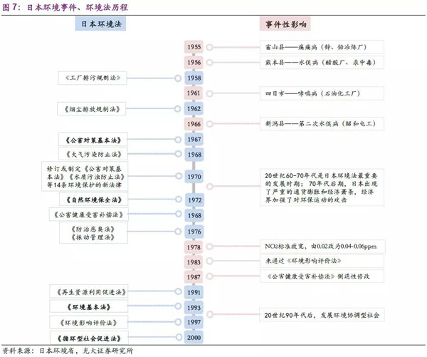 20世紀(jì)50-70年代,日本快速實(shí)現(xiàn)工業(yè)化,經(jīng)濟(jì)成就舉世矚目,但期間各類公害事件頻發(fā),成為了尖銳的社會(huì)和政治問題。在此背景下,以1967年《公害對(duì)策基本法》為核心的環(huán)保法律體系應(yīng)運(yùn)而生,日本環(huán)保產(chǎn)業(yè)開始了上升周期。雖然環(huán)保政策在80年代初經(jīng)濟(jì)下行時(shí)稍有反復(fù),但也僅是過程中的擾動(dòng)。隨著工業(yè)化及城鎮(zhèn)化達(dá)到一定階段,日本末端治污需求逐漸減弱,2000年以《循環(huán)型社會(huì)促進(jìn)法》為核心的法律體系應(yīng)運(yùn)而生,日本大力推進(jìn)循環(huán)經(jīng)濟(jì)的國(guó)策,以減輕自身由于資源匱乏的限制,實(shí)現(xiàn)了法律體系由“被動(dòng)”到“主動(dòng)”的過程。