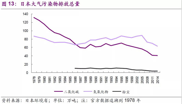 從大氣污染排放總量上來看,日本20世紀(jì)70-80年代二氧化硫排放總量快速下降,這與期間法律法規(guī)的完善,煙氣脫硫力度增加有很大關(guān)系,而且治理效果很明顯,說明一般固定排放源安裝脫硫設(shè)施便可以達(dá)到較好的效果。