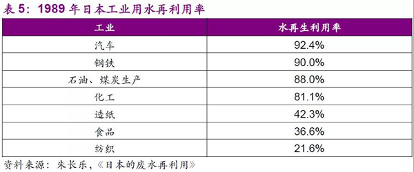日本工業(yè)用水消耗量隨工業(yè)化發(fā)展迅速提升,1989年工業(yè)水消耗量達(dá)到1.44億立方米/日,耗水大戶為化工、鋼鐵、造紙,占總量約70%左右。1965年工業(yè)水的再利用率僅為36%,日本從改革生產(chǎn)工藝入手,盡量采用資源利用率高、污染物排放量少的先進(jìn)工藝,最大限度地利用水資源,使得再利用率在1975年達(dá)到67%、1989年進(jìn)一步達(dá)到76%;行業(yè)方面,汽車、石油、煤炭工業(yè)和化學(xué)工業(yè)都具有高水再生利用率,而紡織、食品、造紙工業(yè)的水再生利用率較低,原因在于前者冷卻、空調(diào)等用水易于回收,而后者常為洗滌用水,較難以處理。(朱長(zhǎng)樂,《日本的廢水再利用》)