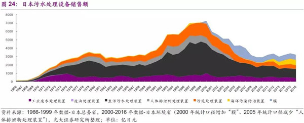 從污水處理市場(chǎng)空間分析:工業(yè)污水設(shè)備的需求體現(xiàn)了工業(yè)化以及法規(guī)發(fā)展過程,日本的工業(yè)污水處理市場(chǎng)在70年代達(dá)到一個(gè)高峰,后期相對(duì)平穩(wěn);而生活污水處理設(shè)備及市政設(shè)施建設(shè)則與城鎮(zhèn)化、房地產(chǎn)周期以及法規(guī)發(fā)展過程相關(guān),日本的生活污水處理市場(chǎng)則在20世紀(jì)90年代中后期達(dá)到高峰;海洋污染防治在2011年開始受重視,設(shè)備需求在逐步提升的過程中。