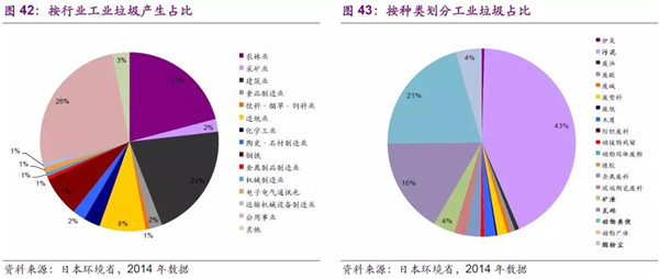 按行業(yè)劃分分析工業(yè)垃圾產(chǎn)量:公用事業(yè)行業(yè)產(chǎn)生垃圾最多,占比最高26%,其次為農(nóng)林業(yè)和建筑業(yè)均為21%;按種類劃分污泥占比最高,達(dá)到43%,其次為動(dòng)物糞便為21%,再次是瓦礫占比為16%。從分類來看,產(chǎn)生行業(yè)和垃圾種類能夠較好的對(duì)應(yīng)上。