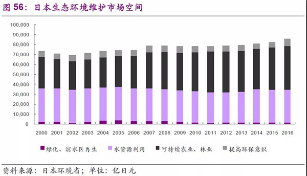 日本的生態(tài)維護(hù)市場(chǎng)主要是面向自然資源的維護(hù),主要體現(xiàn)在水資源利用和可持續(xù)發(fā)展農(nóng)業(yè)和林業(yè)。市場(chǎng)空間方面,2016年綠化、濱水區(qū)再生為1781億日元、水資源利用3.3萬億日元、可持續(xù)農(nóng)業(yè)及林業(yè)為4.4萬億日元、提高環(huán)保意識(shí)措施為6793億日元。