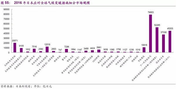 在日本應(yīng)對(duì)全球氣候變暖措施分類上,主要有清潔能源利用、節(jié)能、汽車低耗燃料等具體措施,2016年整體的市場(chǎng)空間可以達(dá)33萬億日元(日本環(huán)境省數(shù)據(jù))。具體細(xì)分來看,以2016年為例,節(jié)能建筑、低油耗低排放及混合動(dòng)力車輛、太陽能產(chǎn)業(yè)、蓄電池、節(jié)能照明設(shè)施等是未來重要的發(fā)展方向。