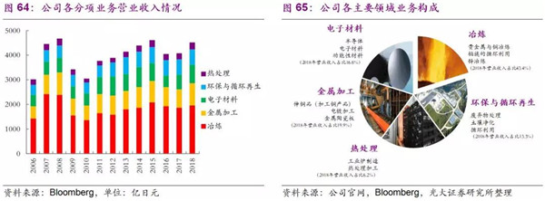 公司從1884年秋田縣小坂礦山起步,逐步發(fā)展到從金屬的生產(chǎn)開始到高附加價(jià)值產(chǎn)品的制造、以及廢棄物的處理及循環(huán)利用,開展著特有的循環(huán)型事業(yè)活動(dòng),這也契合了當(dāng)前日本綠色發(fā)展的產(chǎn)業(yè)要求。公司目前共有五大服務(wù)領(lǐng)域:環(huán)保與循環(huán)再生、冶煉、電子材料、金屬加工、以及熱處理,2018年?duì)I業(yè)收入達(dá)4548億日元,各業(yè)務(wù)營(yíng)業(yè)收入占比相對(duì)穩(wěn)定,其發(fā)家的冶煉業(yè)務(wù)營(yíng)業(yè)收入占比常年保持在40%以上。