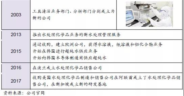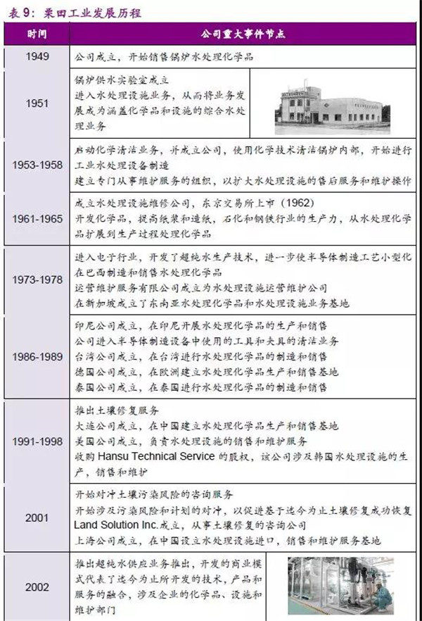 公司起步于鍋爐清洗化學(xué)品銷售,在成立早期雖經(jīng)歷一定坎坷,但最終公司的技術(shù)和產(chǎn)品逐漸被市場(chǎng)認(rèn)可,成為市場(chǎng)的主導(dǎo)產(chǎn)品。伴隨日本工業(yè)化進(jìn)程發(fā)展,1953年后公司的業(yè)務(wù)范圍不僅局限于化學(xué)品產(chǎn)品,也開始進(jìn)入設(shè)備領(lǐng)域,尤其是在水處理設(shè)備市場(chǎng),如:離子交換樹脂、水軟化及純水設(shè)備是公司具有核心競(jìng)爭(zhēng)力的產(chǎn)品。公司通過不斷學(xué)習(xí)并獲取過濾設(shè)備、流量控制等多項(xiàng)技術(shù),逐步確立了鍋爐水供應(yīng)的市場(chǎng)地位。