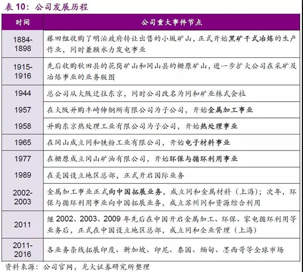 同和控股的歷史可以追溯到1884年,當(dāng)時(shí)藤田組收購了政府轉(zhuǎn)讓出售的秋田縣小坂礦山后,從采礦及冶煉事業(yè)開始起步,先是通過不斷的收購礦山壯大其在采礦及冶煉事業(yè)的業(yè)務(wù),隨后抓住時(shí)代變遷的機(jī)遇,先后涉獵金屬加工、熱處理、電子材料、以及環(huán)保等其他領(lǐng)域,目前已形成了由五大核心事業(yè)部構(gòu)成的有著“產(chǎn)—供—銷—收”全過程產(chǎn)業(yè)鏈的循環(huán)性事業(yè)。