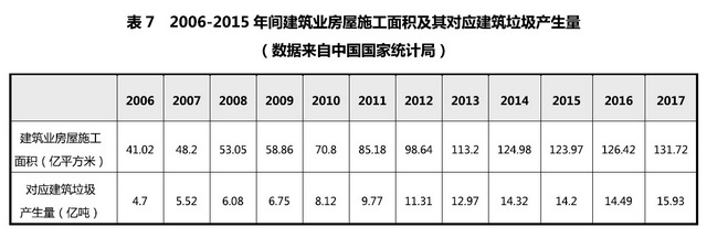 按照我國(guó)《民用建筑設(shè)計(jì)通則》,重要建筑和高層建筑主體結(jié)構(gòu)的耐久年限為100年,一般建筑為50~100年?!笆晃濉逼陂g,全國(guó)共有46億平方米建筑被拆除,其中20億平方米建筑在拆除時(shí)壽命小于40年。據(jù)測(cè)算,每10000平米建筑施工面積平均產(chǎn)生550噸建筑垃圾,建筑施工面積對(duì)城市建筑垃圾產(chǎn)量的貢獻(xiàn)率為48%。保守估計(jì),2017年全國(guó)共計(jì)產(chǎn)生建筑垃圾15.93億噸。