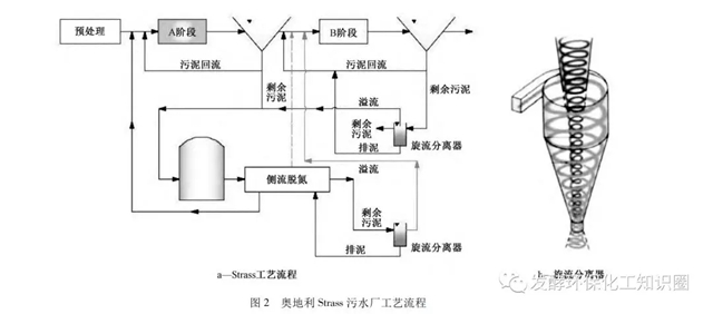 斯特拉斯污水處理廠以主流傳統(tǒng)工藝( AB法)與側(cè)流新型脫氮工藝( 厭氧氨氧化) 相結(jié)合的方式,運(yùn)行工藝如圖2a所示??芍? 污水經(jīng)過預(yù)處理進(jìn)入A段吸附( adsorption) 去除有機(jī)物,可有效防止過高的有機(jī)物對厭氧氨氧化菌的抑制。之后污水進(jìn)入B段生物降解過程( biodegradation) ,即采用一體式厭氧氨氧化工藝脫氮。在A段吸附了大量有機(jī)物的污泥,經(jīng)過排泥、剩余污泥濃縮、厭氧消化和脫水等過程后,產(chǎn)生的污泥厭氧消化液和污泥脫水液氨氮濃度較高,采用側(cè)流厭氧氨氧化DEMON工藝脫氮。側(cè)流部分通過旋流分離器( 圖2b) 分離絮體( 主要是AOB)和顆粒污泥( 主要AnAOB) ,從而富集厭氧氨氧化菌。在主流工藝中,除了傳統(tǒng)方式的污泥回流外,還需要回流測流工藝的污泥實(shí)現(xiàn)對AOB和AnAOB生物強(qiáng)化。除此之外,該工藝還將部分污泥消化液定期回流至B階段,進(jìn)行氨氮負(fù)荷的調(diào)控。