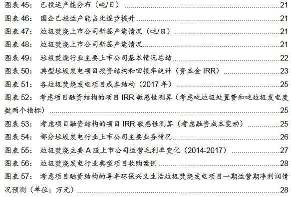 情景:考慮項(xiàng)目融資結(jié)構(gòu)的資本金IRR測算:我們假設(shè)項(xiàng)目的資本結(jié)構(gòu)為70%債務(wù),30%自有資金,參考中國天楹/綠色動(dòng)力的公司財(cái)務(wù)狀況,假設(shè)其項(xiàng)目的債務(wù)資金的綜合成本分別為6.5%/5.6%,各個(gè)項(xiàng)目每年將新增部分財(cái)務(wù)費(fèi)用,我們計(jì)算得到各個(gè)項(xiàng)目慮融資杠桿后的IRR,其中最高的為綠色動(dòng)力海寧項(xiàng)目IRR為30.0%,主因?yàn)槠鋰嵗l(fā)電量和噸投資額均為所列示可比項(xiàng)目最低。中國天楹延吉項(xiàng)目和康恒廣水項(xiàng)目IRR相對較低分別為17.1%/20.3%,主因其垃圾處置費(fèi)明顯較低,且中國天楹延吉項(xiàng)目噸垃圾發(fā)電量顯著低于其他項(xiàng)目。根據(jù)我們的敏感性分析,假設(shè)垃圾處置費(fèi)增加5元/噸,各個(gè)垃圾發(fā)電項(xiàng)目IRR增加0.6 pct -0.9pct;噸垃圾發(fā)電+20千瓦時(shí)/噸,各個(gè)項(xiàng)目的IRR增加.5pct ~2.3 pct。