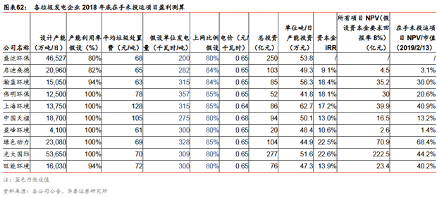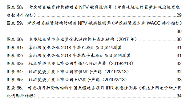 典型項(xiàng)目的NPV考慮項(xiàng)目融資結(jié)構(gòu)的項(xiàng)目NPV測算:我們假設(shè)項(xiàng)目的資本結(jié)構(gòu)為70%債務(wù),30%自有資金,參考中國天楹/綠色動(dòng)力的公司財(cái)務(wù)狀況,假設(shè)其項(xiàng)目的債務(wù)資金的綜合成本分別為6.5%/5.6%,各個(gè)項(xiàng)目每年將新增部分財(cái)務(wù)費(fèi)用。依據(jù)之前的投資數(shù)據(jù)和現(xiàn)金流數(shù)據(jù),我們計(jì)算得到各個(gè)項(xiàng)目考慮融資杠桿后的NPV,其中最高的為康恒寧波項(xiàng)目,其NPV為6.8億元,主要是因?yàn)槠鋰嵗幹觅M(fèi)高于其他所有項(xiàng)目,并且噸垃圾發(fā)電量也處于相對較高水平;而天楹延吉項(xiàng)目、康恒廣水項(xiàng)目、綠色動(dòng)力海寧、綠色動(dòng)力永嘉項(xiàng)目一期的NPV均較低,分別為1.08億元、1.01億元、1.31億元、0.97億元,主要因?yàn)榍皟蓚€(gè)項(xiàng)目的噸垃圾處置費(fèi)和噸垃圾發(fā)電量均較低,而后兩個(gè)項(xiàng)目的噸垃圾處置費(fèi)較低。我們再次計(jì)算了各項(xiàng)目的單位產(chǎn)能NPV,發(fā)現(xiàn)天楹延吉項(xiàng)目、康恒廣水項(xiàng)目、綠色動(dòng)力永嘉項(xiàng)目一期的該指標(biāo)分別僅有13.56萬元/噸、16.89萬元/噸、19.48萬元/噸,而康恒寧波項(xiàng)目、綠色動(dòng)力永嘉項(xiàng)目二期、綠色動(dòng)力海寧項(xiàng)目則分別達(dá)到30.24萬元/噸、28.83萬元/噸、26.14萬元/噸,再一次反映了后三個(gè)項(xiàng)目相對更高的噸垃圾處置費(fèi)和噸垃圾發(fā)電量所帶來的更高的項(xiàng)目價(jià)值。根據(jù)我們的敏感性分析,假設(shè)垃圾處置費(fèi)增加5元/噸,各個(gè)垃圾發(fā)電項(xiàng)目的NPV增加410-2809萬元;噸垃圾發(fā)電增加20千瓦時(shí)/噸,各個(gè)項(xiàng)目的NPV增加區(qū)間為611-4830萬元。我們考慮融資成本和WACC兩個(gè)指標(biāo)再次對各個(gè)項(xiàng)目的NPV進(jìn)行敏感性分析,發(fā)現(xiàn)融資成本增加0.3pct時(shí), 各個(gè)項(xiàng)目的NPV降低322萬元-2120萬元;WACC增加0.5pct時(shí),各個(gè)項(xiàng)目的NPV降低789萬元-5033萬元。