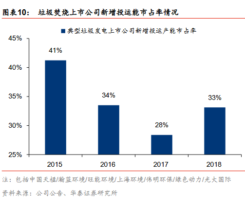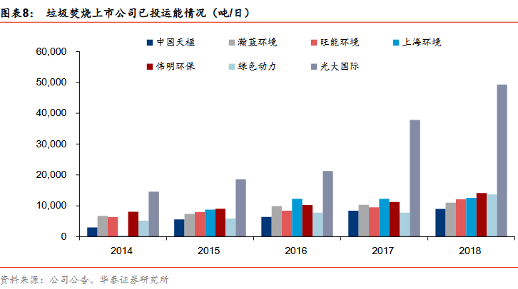 新增訂單趨勢:國企拿單能力強(qiáng)于民企。我們對光大國際、綠色動(dòng)力、瀚藍(lán)環(huán)境、上海環(huán)境、盛運(yùn)環(huán)保、中國天楹、旺能環(huán)境、偉明環(huán)保幾家典型垃圾發(fā)電上市公司2015-2018年新簽訂單進(jìn)行分析,其中光大國際、綠色動(dòng)力、瀚藍(lán)環(huán)境、上海環(huán)境四家國企2015年新簽訂單1.8萬噸/日,占8家上市公司新簽訂單總產(chǎn)能的45%,2016年提升至52%、2017年繼續(xù)提升至56%,2018年四家國企新簽訂單總產(chǎn)能為5.5萬噸/日,占比提升至80%,國企拿單能力顯著強(qiáng)于民企。