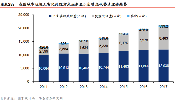 驅(qū)動(dòng)因素二:土地有限,鄰避效應(yīng)減弱驅(qū)使填埋轉(zhuǎn)焚燒在我國,垃圾焚燒相比于填埋方式優(yōu)勢顯著,更受政策鼓勵(lì)。我國主要垃圾處理方式有衛(wèi)生填埋、焚燒發(fā)電和堆肥等三種方式。衛(wèi)生填埋是目前我國城市垃圾處理的主導(dǎo)方式,但存在二次污染隱患;堆肥方式在我國已逐漸退出,具有項(xiàng)目建設(shè)成本高、效益低、存在重金屬污染等問題,處理規(guī)模受到限制;相比之下,垃圾焚燒方式不僅污染控制標(biāo)準(zhǔn)已與國際標(biāo)準(zhǔn)(GB標(biāo)準(zhǔn))接軌,經(jīng)濟(jì)效益也遠(yuǎn)優(yōu)于衛(wèi)生填埋,具有盈利模式清晰,市場化程度高,可持續(xù)等優(yōu)勢,因此具有較大發(fā)展空間。根據(jù)國家統(tǒng)計(jì)局統(tǒng)計(jì)數(shù)據(jù),“十二五”期間我國垃圾焚燒處理能力增長了149.7%?!笆濉蹦├贌幚砹空祭鵁o害化處理量34%,復(fù)合增速為22%,衛(wèi)生填埋處理量垃圾無害化處理64%,復(fù)合增速為4%,“十二五”期間垃圾焚燒處理量增速顯著高于衛(wèi)生填埋處理量增速。