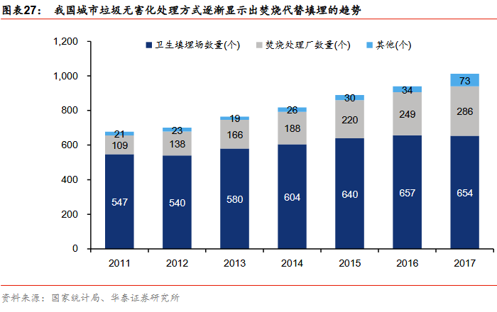 我國垃圾填埋占比下降,焚燒發(fā)電仍處于成長期。根據(jù)E20研究院最新統(tǒng)計(jì)數(shù)據(jù),城市垃圾填埋場的規(guī)模逐漸減小,由2008年的622噸/日座降至2016年的533噸/日座,城市生活垃圾處理方式正在由衛(wèi)生填埋向垃圾焚燒發(fā)電轉(zhuǎn)變,填埋場處理對象從生活垃圾向焚燒殘?jiān)D(zhuǎn)變。