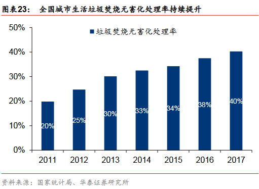 驅(qū)動(dòng)因素一:需求的持續(xù)擴(kuò)張垃圾焚燒發(fā)電行業(yè)持續(xù)擴(kuò)張主要推動(dòng)因素包括:1)垃圾產(chǎn)生量和清運(yùn)量持續(xù)提升:我國城市垃圾清運(yùn)量由2011年的1.64億噸上升到2017年的2.15億噸,年均復(fù)合增速4.6%,城鎮(zhèn)化的持續(xù)推進(jìn)、生活水平的逐步提高,我們認(rèn)為,城市垃圾產(chǎn)生量和清運(yùn)量仍將保持增長;2)垃圾焚燒占有率快速提升,垃圾焚燒占生活垃圾無害化處理量的比例從2011年的20%增長到2017年的40%。