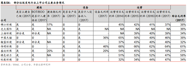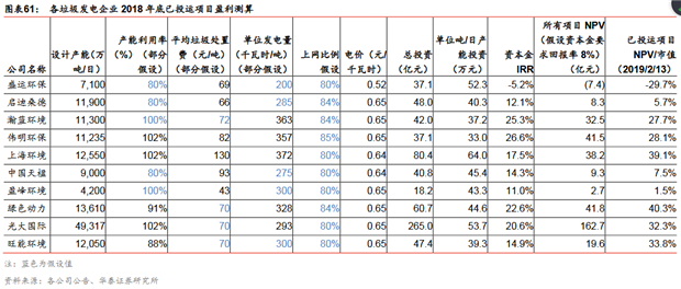 項(xiàng)目達(dá)產(chǎn)后主要收入來自發(fā)電收入,主要成本來自折舊、原材料和人工:首先假設(shè)該項(xiàng)目資金100%來自自有資金投資的情況下,則項(xiàng)目主要的收入、成本情況如下:1)收入:垃圾處置收入+發(fā)電收入。項(xiàng)目達(dá)產(chǎn)后,滿產(chǎn)狀態(tài)下可得出項(xiàng)目的年垃圾處理量,按照各個(gè)項(xiàng)目的垃圾處置費(fèi)(所列項(xiàng)目中最高為康恒寧波項(xiàng)目的149元/噸,最低為中國天楹延吉項(xiàng)目的58元/噸),則項(xiàng)目除增值稅后可測得年垃圾處置收入;按照0.65元/度的發(fā)電收入(部分項(xiàng)目比如康恒寧波項(xiàng)目、綠色動(dòng)力永嘉、綠色動(dòng)力海寧項(xiàng)目為0.66元/度),結(jié)合各項(xiàng)目噸垃圾發(fā)電量(所列項(xiàng)目中最高為綠色動(dòng)力海寧項(xiàng)目的410度/噸,最低為中國天楹延吉項(xiàng)目的280度/噸),結(jié)合個(gè)項(xiàng)目的上網(wǎng)比例(79%-85%之間),可測得扣除增值稅后年垃圾發(fā)電收入;可以看出,噸垃圾處置費(fèi)和噸垃圾發(fā)電量是決定收入端的主要變量。2)成本:以中國天楹延吉項(xiàng)目為例,根據(jù)其非公開發(fā)行報(bào)告書披露,成本構(gòu)成中折舊占比47%(天楹按照資產(chǎn)預(yù)計(jì)使用壽命與該BOT項(xiàng)目特許經(jīng)營權(quán)協(xié)議規(guī)定的經(jīng)營期孰低確定,基本上折舊年限在20年)、原材料占比20%、工資及福利占比15%、維護(hù)費(fèi)用(考慮大修、年修及日常維護(hù)費(fèi)用)占比11%、污水及爐渣處置占比7%??傮w來看,成本端中折舊攤銷、原材料和人工占比在80%左右。