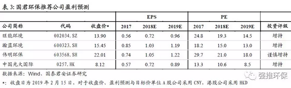 配置垃圾焚燒板塊中處于成長(zhǎng)期的龍頭公司,推薦產(chǎn)能釋放加速、盈利能力改善、項(xiàng)目?jī)?yōu)質(zhì)的公司,包括:1)2019年為產(chǎn)能釋放大年、利潤(rùn)率改善明顯的旺能環(huán)境;2)項(xiàng)目多位于浙江地區(qū)、盈利能力強(qiáng)的偉明環(huán)保;3)項(xiàng)目多位于珠三角地區(qū)、運(yùn)營(yíng)穩(wěn)健的瀚藍(lán)環(huán)境;4)行業(yè)產(chǎn)能第一龍頭中國光大國際。