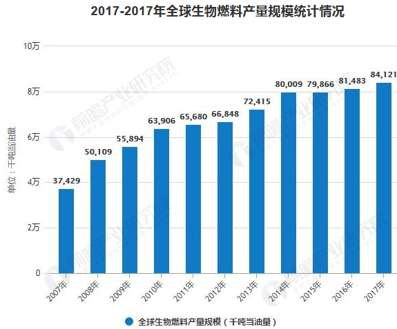 隨著全球大規(guī)模、大范圍的發(fā)展生物質(zhì)能發(fā)電,生物燃料生物燃料產(chǎn)量規(guī)模也實(shí)現(xiàn)的迅速的增長(zhǎng)。數(shù)據(jù)顯示,2007年全球生物燃料產(chǎn)量為3742.9萬(wàn)噸當(dāng)油量,至2017年上升至8412.1萬(wàn)噸當(dāng)油量,2008-2017年復(fù)合增長(zhǎng)率達(dá)8.43%。