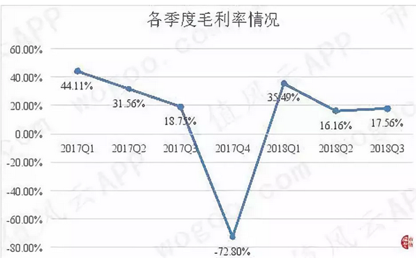 盛運(yùn)環(huán)保各季度的毛利率波動(dòng)比較大,比如2017年第一季度的毛利率為44.11%,2018年第一季度的毛利率為35.49%,而2017年第四季度的毛利率為-72.80%,2018年第二、三季度的毛利率分別為16.16%、17.56%,巨幅的毛利率波動(dòng)說(shuō)明公司的毛利率存在異常波動(dòng)。