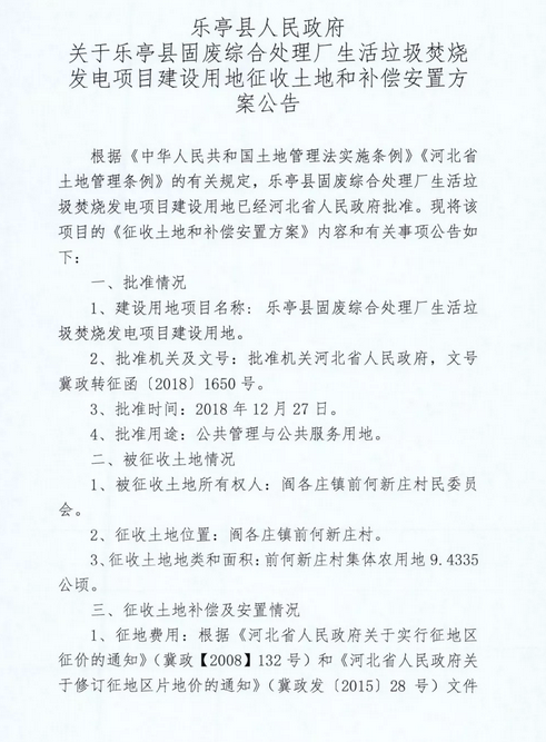 日前河北樂亭縣生活垃圾焚燒發(fā)電項目征收土地和補償安置方案公告公示,具體內容如下: