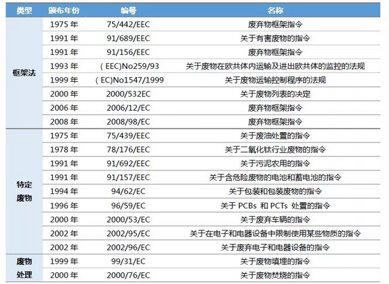 歐盟通過廢棄物框架指令確立了固廢處理的理念,建立了固廢處理體系,其相關(guān)的環(huán)境法律政策實際由兩部分組成,一部分是各類指令,從法律上直接對各成員國起約束作用,另一部分是定期頒布的環(huán)境行動規(guī)劃,對各成員國進行目標(biāo)、內(nèi)容上的指導(dǎo)。