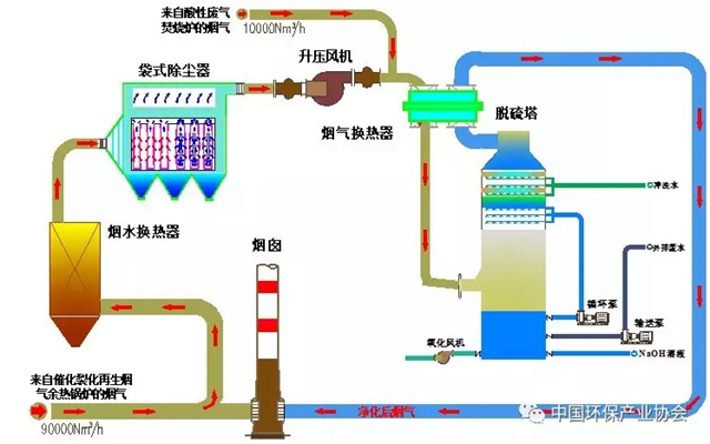 催化裂化余熱鍋爐高溫煙氣經(jīng)煙水換熱器,溫度由230℃~250℃降至150℃~200℃。進入高效袋式除塵器除塵,高效袋式除塵器濾袋采用“863”科研成果PM2.5專用濾料。煙氣除塵后由引風機增壓后與酸性廢氣焚燒爐煙氣混合,混合煙氣進入煙氣換熱器,煙氣溫度由180℃降至142℃,然后進入脫硫塔,在脫硫塔內(nèi)煙氣中的SO2與NaOH溶液逆向接觸,脫除SO2,煙氣中霧滴經(jīng)高效除霧器后至煙氣換熱器。煙氣溫度由53℃升溫至90℃,升溫后煙氣進入煙囪排放。
