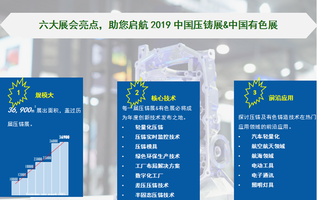 中國壓鑄展和中國有色展力爭走在行業(yè)前沿,通過展品及現(xiàn)場10多場專題論壇,發(fā)布并展示壓鑄生產(chǎn)工藝中,具有創(chuàng)新性、行業(yè)關(guān)注的熱點(diǎn)解決方案:結(jié)構(gòu)件壓鑄技術(shù)、綠色環(huán)保生產(chǎn)技術(shù)、智能制造方案、數(shù)字化工廠、數(shù)控機(jī)床、半固態(tài)壓鑄技術(shù)、鎂合金鑄件技術(shù)等話題,優(yōu)化工藝流程,提高能源利用效率。