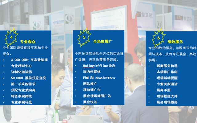 CHINA DIECASTING 2019中國壓鑄展和CHINA NONFERROUS 2019中國有色展是展商尋找重要客戶群體、建立全新業(yè)務(wù)聯(lián)系的理想平臺(tái)。2018年414家參展商中90%的展商確認(rèn)他們?cè)谡箷?huì)上找到了主要目標(biāo)群體。2019年展會(huì)前期將有專業(yè)團(tuán)隊(duì),通過呼叫中心、訂制化邀請(qǐng)函、展前預(yù)覽直投等多渠道邀請(qǐng)重要買家和專業(yè)觀眾,設(shè)計(jì)特色參觀路線,提供專業(yè)參觀導(dǎo)覽,提高展商與采購的配對(duì)效率。