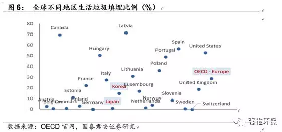 在城市人口密度與中國較為接近的韓國、日本、德國、英國等國家,垃圾焚燒+資源回收方式幾乎占據(jù)處置規(guī)模的80%,填埋率均低于20%。其中日本焚燒比例達77%,歐洲垃圾焚燒占比加權(quán)平均值約27%。