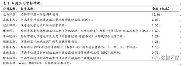 根據(jù)公告與招投標信息統(tǒng)計,本周環(huán)保公司中新增訂單9單、中標總金27.28億;新增訂單前三名分別為龍馬環(huán)衛(wèi)、東珠生態(tài)和創(chuàng)業(yè)環(huán)保。