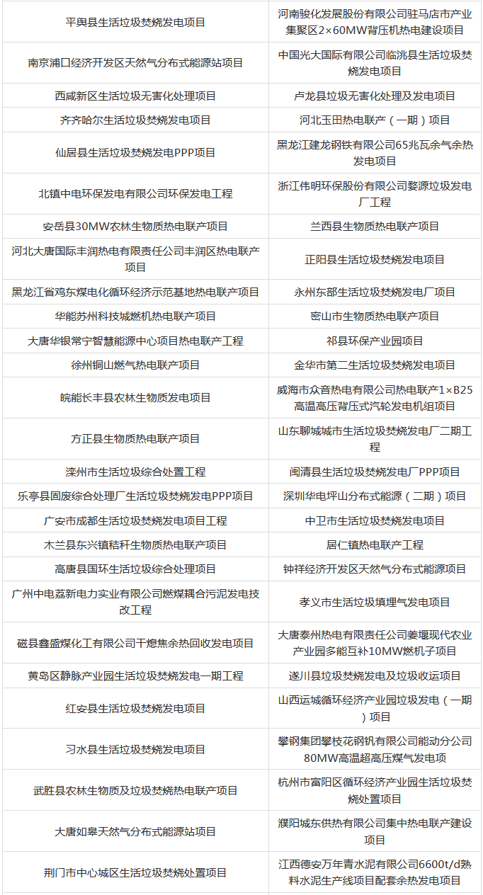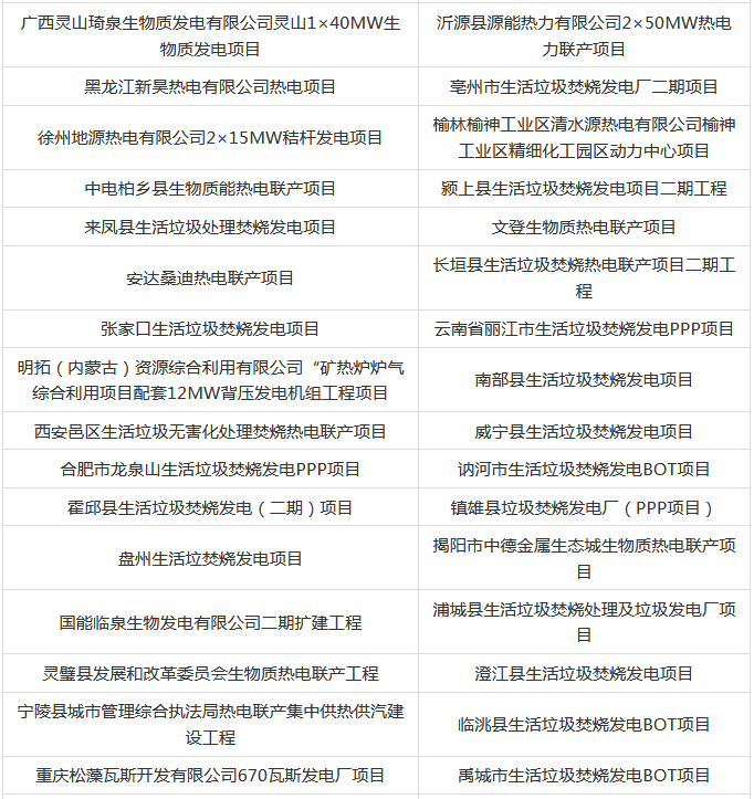其中大部分為垃圾發(fā)電項(xiàng)目,涉及生物質(zhì)發(fā)電建設(shè)項(xiàng)目、生活垃圾焚燒發(fā)電項(xiàng)目、生物質(zhì)熱電聯(lián)產(chǎn)項(xiàng)目等,具體項(xiàng)目名單如下: