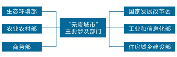 由于“無廢城市”建設(shè)試點涉及的技術(shù)性強、領(lǐng)域多、范圍廣,因此政府應(yīng)是“無廢城市”建設(shè)重要的責(zé)任主體,應(yīng)當(dāng)強化頂層設(shè)計引領(lǐng),發(fā)揮政府宏觀指導(dǎo)作用。下圖列示了建設(shè)“無廢城市”涉及的主要政府職能部門。