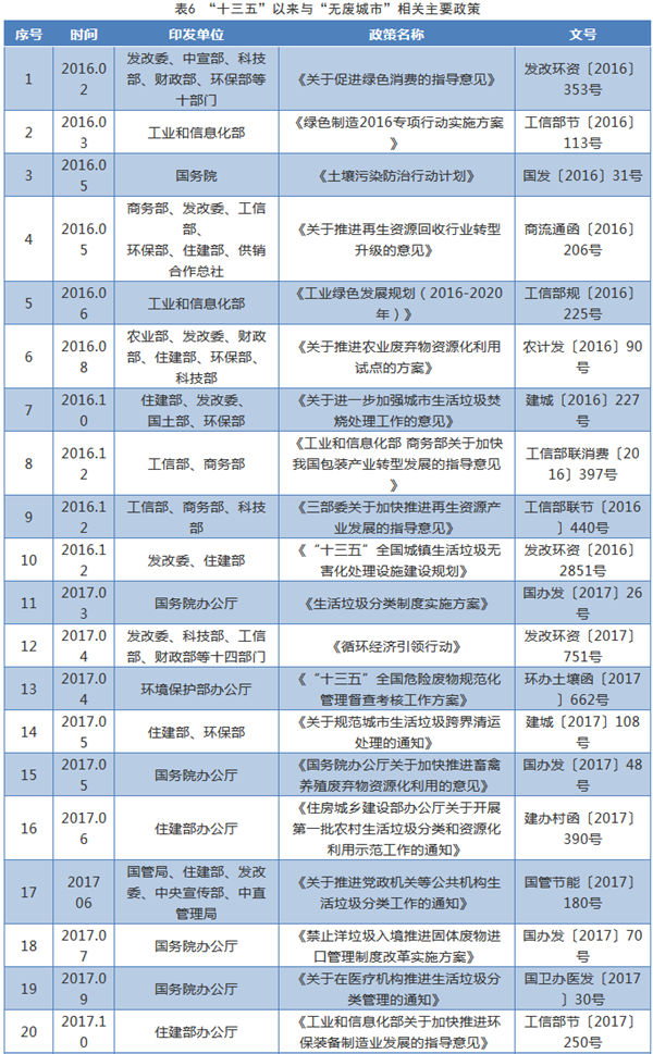 “十三五”以來,國家頻繁出臺(tái)相關(guān)政策為“無廢城市”的建設(shè)進(jìn)行鋪墊,這些政策對(duì)于“無廢城市”建設(shè)發(fā)展影響重大、指導(dǎo)意義深遠(yuǎn)。