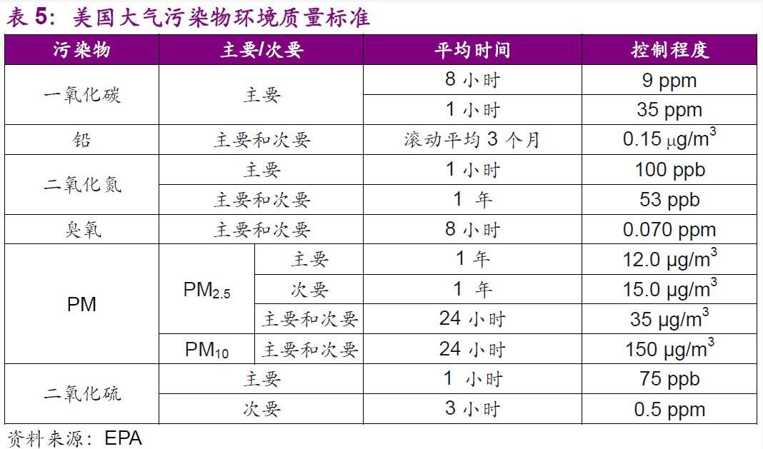 綜上所述,美國的大氣環(huán)保治理隨污染(洛杉磯煙霧、多諾拉事件)而起,通過一系列法律法規(guī)的修訂、全方面污染源的控制、以及特有的排污權交易體系的建立,較為成功的實現(xiàn)了空氣環(huán)境的治理和顯著改善。在政策和監(jiān)管的雙重壓力下,美國的排污企業(yè)(電廠、鋼企等)多通過自行研發(fā)并安裝脫硫脫硝設施和優(yōu)化生產(chǎn)技術的方式實現(xiàn)清潔排放,故美國并沒有大型的專精于脫硫脫硝技術的大氣環(huán)保類公司。目前,大氣治理行業(yè)在美國的關注度和市場均處于低位,這與美國目前的工業(yè)企業(yè)產(chǎn)能總量、布局、以及技術的先進程度有著很大關系,美國大氣治理行業(yè)目前的側(cè)重點在室內(nèi)空氣污染技術優(yōu)化和設備創(chuàng)新上,相關公司也多為小型的專注于室內(nèi)空氣污染解決方案和設備銷售的公司。