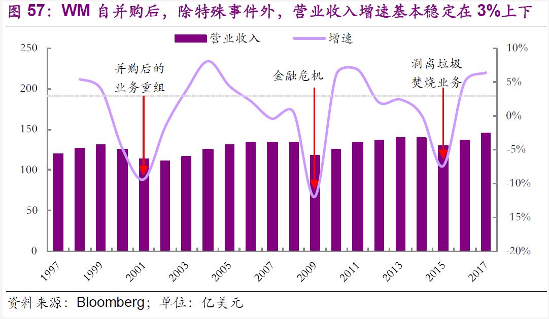 外因內(nèi)策聯(lián)動,助力公司發(fā)展。外因方面,美國居民消費支出增長帶動固廢產(chǎn)生量從1960年的560萬噸提升到1990年的2.08億噸;1970年前后,《固體廢物處置法》等法規(guī)的出臺催化行業(yè)向規(guī)范化標準化成長;固廢處置的成熟技術發(fā)展為固廢綜合管理提供有力支撐,而環(huán)保意識的逐漸完善則成為行業(yè)資源化、精細化處理轉(zhuǎn)型的決定性因素,帶動美國垃圾填埋處理占比從1960年的90%以上下降至2010年的54%,回收利用處理占比則從1960年的6%提升到2010年的34%。內(nèi)策方面,在對的時機采取對的兼并收購策略,先是幫助WM在行業(yè)高速發(fā)展階段通過140余次收購搶占市場份額,成為行業(yè)龍頭;在改變公司歷史的1998年的WM/UW合并后,又通過數(shù)十次大體量的核心業(yè)務收購進一步穩(wěn)固公司市場份額,以及數(shù)十次專業(yè)化新業(yè)務的收購完成新興業(yè)務開拓轉(zhuǎn)型,帶動公司實現(xiàn)新一輪騰飛。