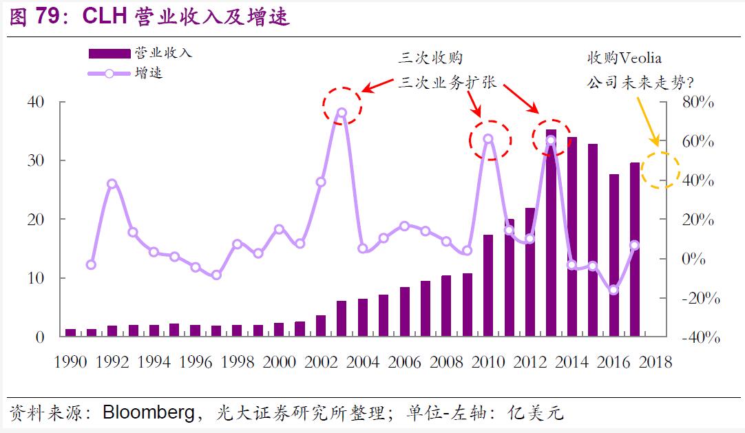公司在成立后的近40年里,通過大大小小近40余次外延并購,在增加危險廢物處理設施的數(shù)量和覆蓋區(qū)域、擴大業(yè)務服務范圍的同時,也致力于增添新的涵蓋多個行業(yè)和業(yè)務類型的服務領域、擴大服務種類,最終從一家小型油罐清潔公司成長為北美領先的環(huán)境和工業(yè)服務提供商和最大的危險廢物處理公司。