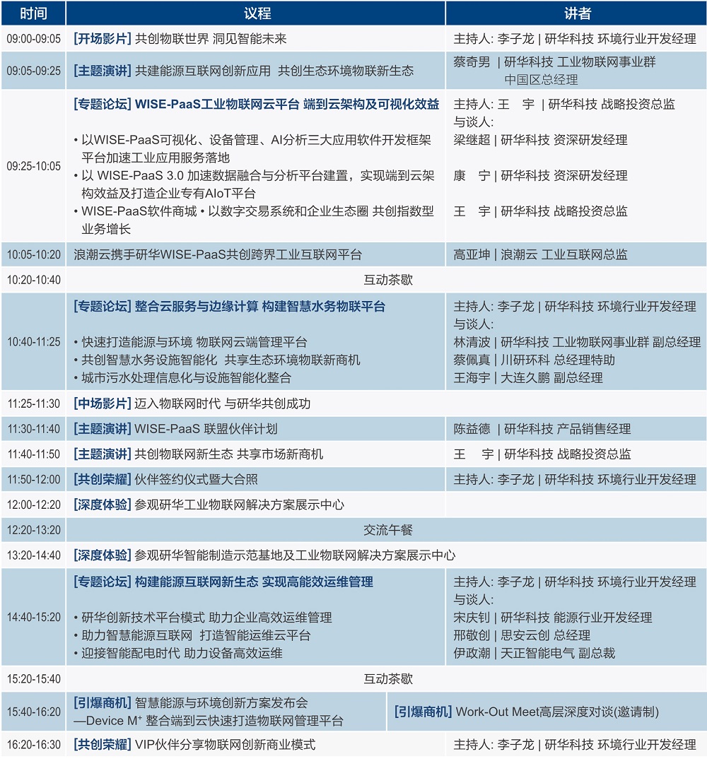 本次論壇主題為“共建能源互聯(lián)網(wǎng)創(chuàng)新應用 共創(chuàng)生態(tài)環(huán)境物聯(lián)新生態(tài)”,旨在共同探討能源互聯(lián)網(wǎng)平臺建設及設施安全;智慧水務及環(huán)保設備運維解決方案,并攜手伙伴分享如何基于研華WISE-PaaS云平臺,發(fā)展數(shù)據(jù)驅動之創(chuàng)新行業(yè)解決方案 ( AIoT.SRP ) 。