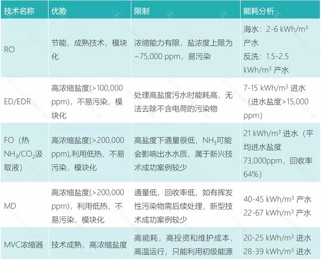 早期ZLD系統(tǒng)鹽水濃縮主要采用熱濃縮技術(shù),機(jī)械式蒸汽壓縮技術(shù)(MVC)及目前應(yīng)用較多的機(jī)械式蒸汽再壓縮技術(shù)(MVR)。MVC技術(shù)的應(yīng)用已經(jīng)有幾十年的歷史,不斷發(fā)展熱回收裝置,但能耗高且需要高品質(zhì)電能仍是該技術(shù)推廣應(yīng)用最大的限制。通常來(lái)說(shuō),每處理1噸進(jìn)水,則消耗20-25 kWh的電能,這已經(jīng)成為其他ZLD濃縮技術(shù)的基準(zhǔn),是其他技術(shù)節(jié)能降耗的方向。為了降低MVC的能耗,實(shí)際工程中常將RO與MVC工藝耦合,利用RO進(jìn)行預(yù)濃縮,能夠大大降低能耗,兩者協(xié)同作用以實(shí)現(xiàn)高鹽廢水零排放。RO的加入可節(jié)省58−75%的能源及48−67%的運(yùn)行成本。然而,將RO應(yīng)用于零排放,有兩個(gè)比較大的限制,膜結(jié)垢/膜污染和濃縮能力較低。新型膜濃縮技術(shù)包括膜蒸餾技術(shù)、正滲透技術(shù)、電滲析技術(shù)等,作為RO濃水進(jìn)一步濃縮工藝,出水則進(jìn)入結(jié)晶過(guò)程。各種膜濃縮技術(shù)的優(yōu)勢(shì)、限制及能耗分析如下表所示。