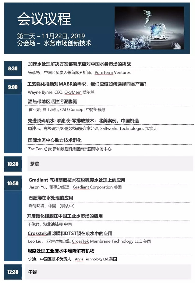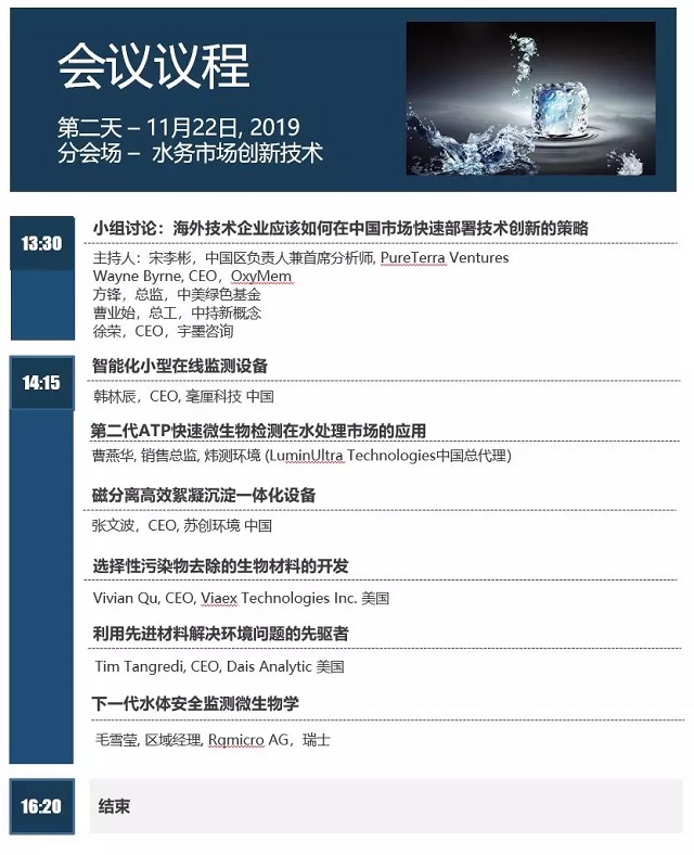 今年的水論壇由來(lái)自中國(guó)和歐洲的影響力水投資基金PureTerra Ventures將以主旨演講“加速水處理解決方案來(lái)應(yīng)對(duì)中國(guó)水務(wù)市場(chǎng)的挑戰(zhàn)”作為開(kāi)場(chǎng)。同時(shí)水論壇還將以海外技術(shù)企業(yè)在中國(guó)市場(chǎng)快速部署技術(shù)創(chuàng)新的策略為主題,進(jìn)行一場(chǎng)互動(dòng)式專題討論會(huì)。