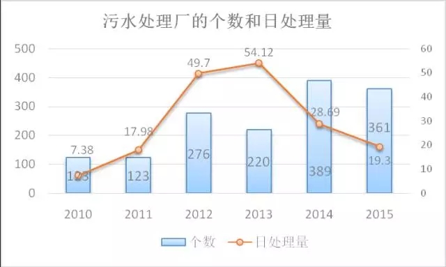 2010-2015進行生活污水處理的鄉(xiāng)的統(tǒng)計情況圖