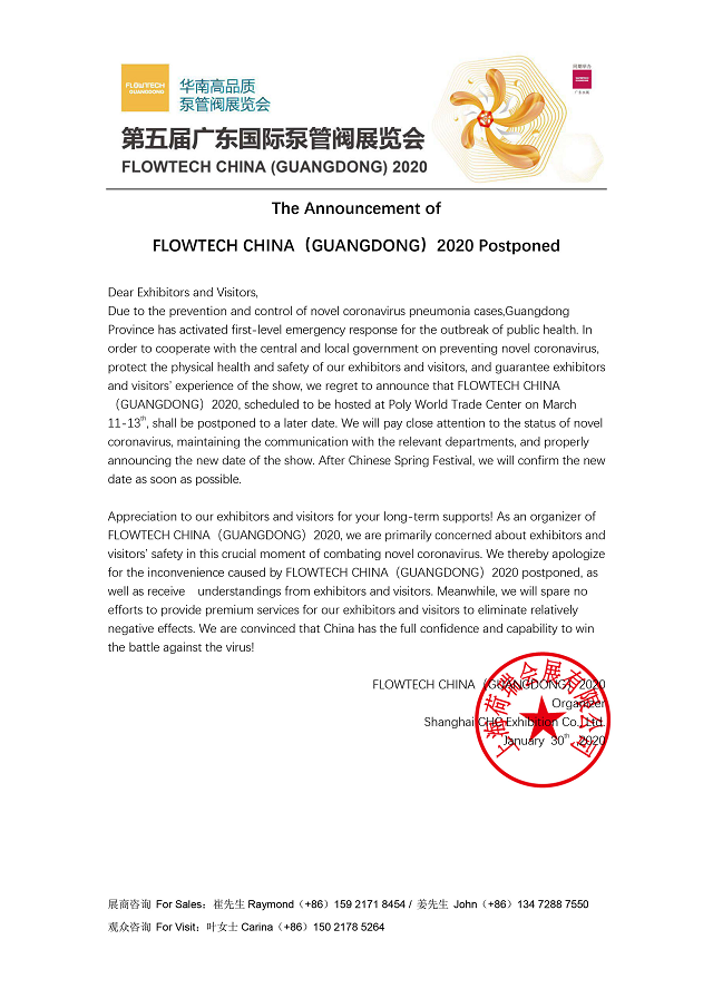 鑒于目前我國新型冠狀病毒感染肺炎疫情防治面臨嚴峻形勢,為配合打贏疫情防御防控阻擊戰(zhàn),切實保障廣大展商、參會人員和觀眾的身體健康和生命安全,根據廣東省防控新型冠狀病毒感染的肺炎疫情工作領導小組辦公室《關于限制群眾性活動的通知》、廣東省商務廳《關于暫停大型經貿活動的緊急通知》和廣州市商務局《關于暫停全市大型展覽活動的通知》中有關疫情防控期間暫停一切大型經貿展覽活動的通知精神,切實保障所有參展人員的身體健康和生命安全,第五屆廣東國際泵管閥展覽會主辦方積極響應國家防疫政策,將原定于2020年3月11-13日在廣州保利世貿博覽館舉辦的第五屆廣東國際泵管閥展覽會延期舉辦,具體舉辦時間將另行通知。