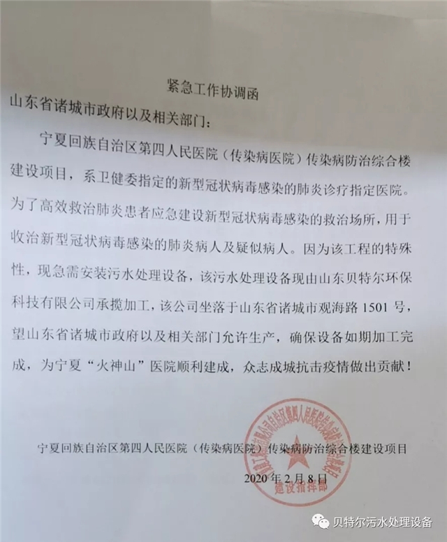 2019年底,臨近春節(jié),當全國人民沉浸在節(jié)日的祥和中時,一場突如其來來的疫情蔓延開來,陰云籠罩在神州大地。武漢告急!湖北告急!全國進入一級響應,各地紛紛伸出援手,一時間,應急物資源源不斷的運往武漢。疫情就是命令,作為一家以致力于環(huán)保事業(yè)的企業(yè),山東貝特爾環(huán)保科技有限公司更是義不容辭,全員一心,共克時艱,為緩解疫情肆虐下醫(yī)院污水處理的巨大壓力,積極準備制作醫(yī)院污水處理設備。在接到寧夏回族自治區(qū)第四醫(yī)院(傳染病醫(yī)院)的求助信函時,第一時間組織員工,加班加點為寧夏第四醫(yī)院趕制兩套醫(yī)院污水處理設備,并于2月11日連夜運往寧夏,為寧夏“火神山”醫(yī)院順利建成,眾志成城抗擊疫情做出貢獻!中國加油!