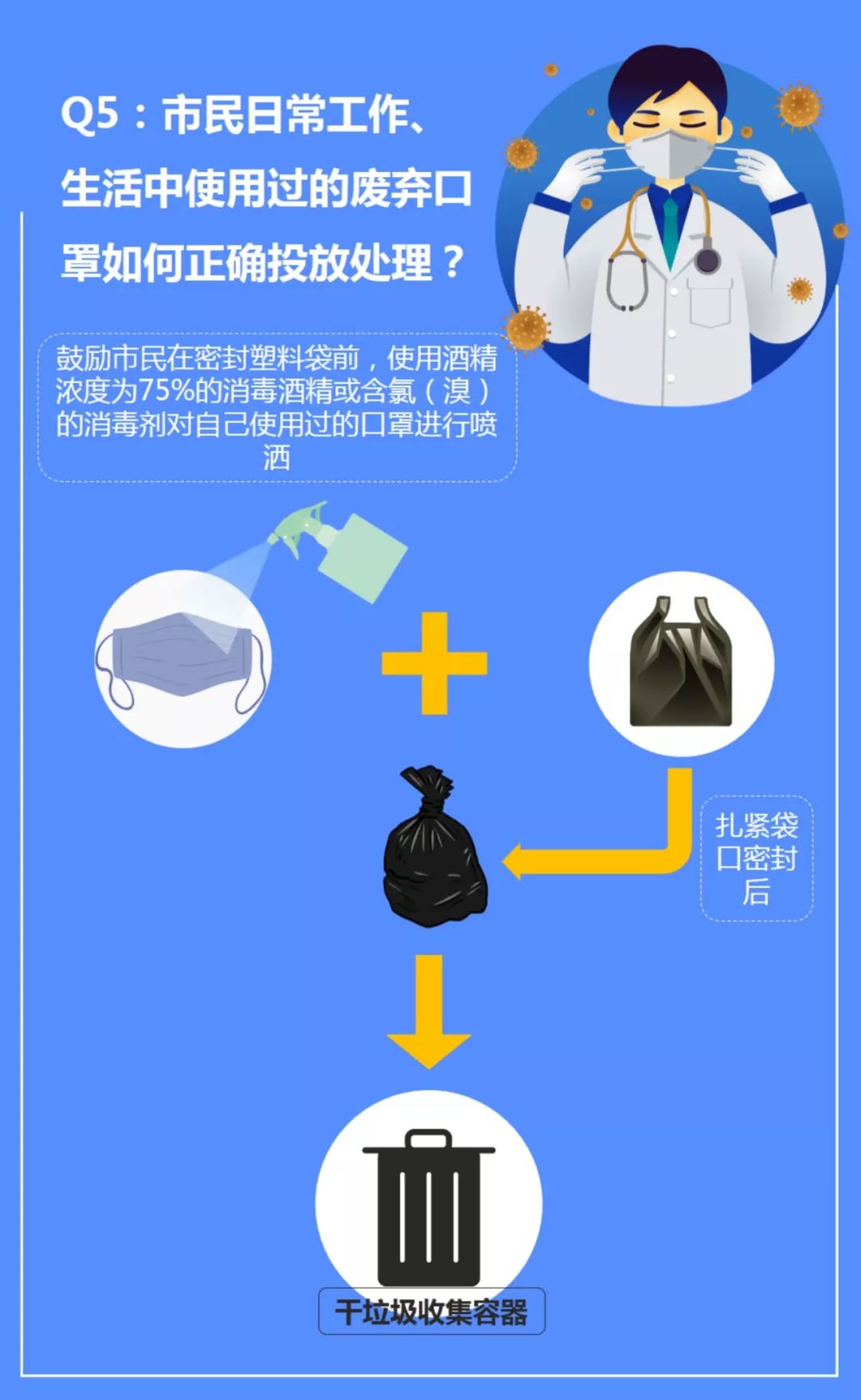鼓勵市民在密封塑料袋前,使用酒精濃度為75%的消毒酒精或含氯(溴)的消毒劑對自己使用過的口罩進(jìn)行噴灑,為后續(xù)極有可能會接觸、處理產(chǎn)生的廢棄物的工作人員,主動提供一份安全關(guān)懷保障。