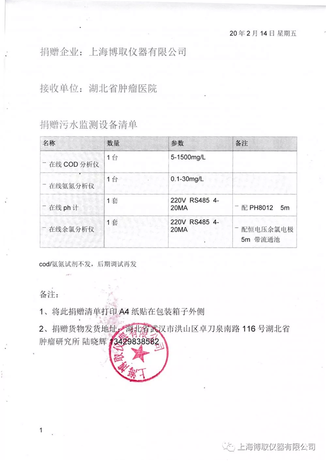 為更好地讓武漢當?shù)蒯t(yī)院救治更多的患者,確保疫情消滅成果,堅決打贏疫情防控阻擊戰(zhàn),上海博取儀器有限公司決定為湖北省腫瘤醫(yī)院捐贈一批水質(zhì)監(jiān)測儀器儀表,在線COD分析儀、在線氨氮分析儀、在線PH計、在線余氯,作為一個有社會責任感的企業(yè),上海博取儀器堅決跟隨國家腳步抗擊此次疫情,為了能讓武漢重見光明,也盡一份綿薄之力。