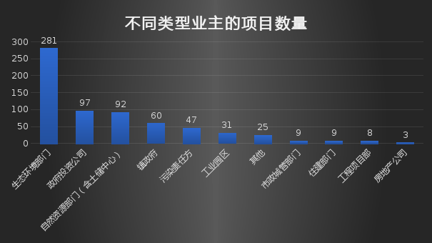 現(xiàn)階段,土壤修復(fù)產(chǎn)業(yè)規(guī)模還比較小,但同時涉及到土地和環(huán)保兩大受關(guān)注要素,因此其市場環(huán)境比較復(fù)雜、業(yè)主類型多樣,大致可分為生態(tài)環(huán)境部門、政府投資公司、自然資源部門(含土地儲備中心)、地方人民政府、污染責(zé)任方、工業(yè)園區(qū)、市政城管部門、住建部門、大型工程項目部、房地產(chǎn)公司和其他。